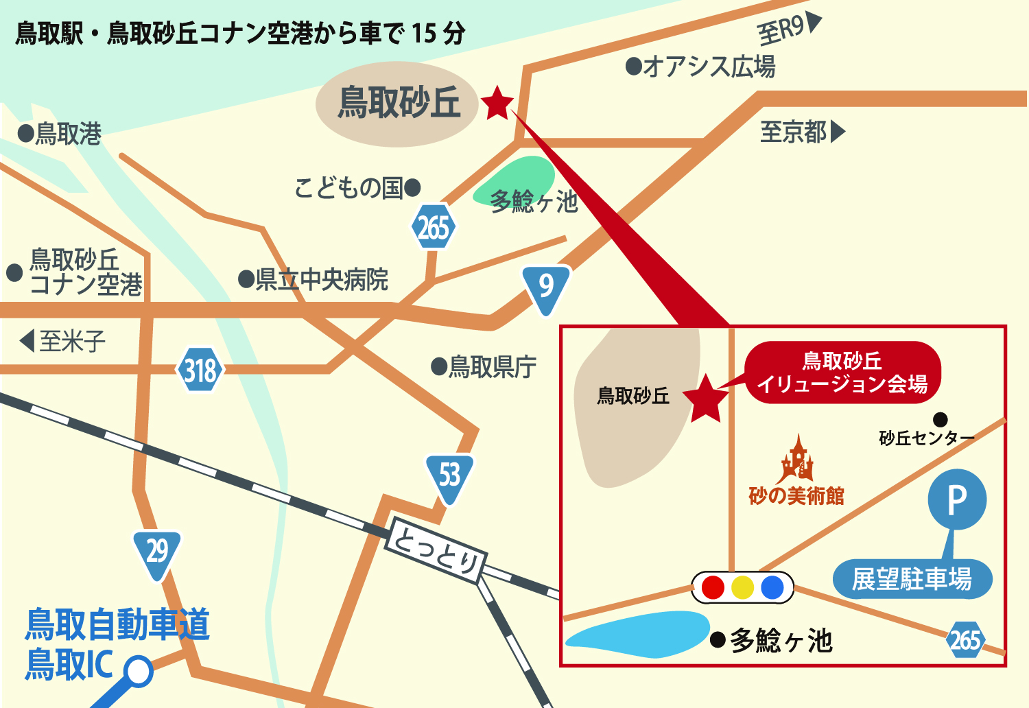 | 車で | 関西方面から | 中国自動車道佐用JCT〜鳥取自動車道鳥取IC (大阪から約2時間30分) |